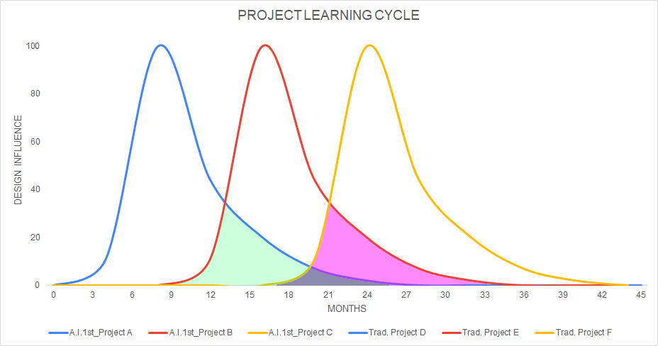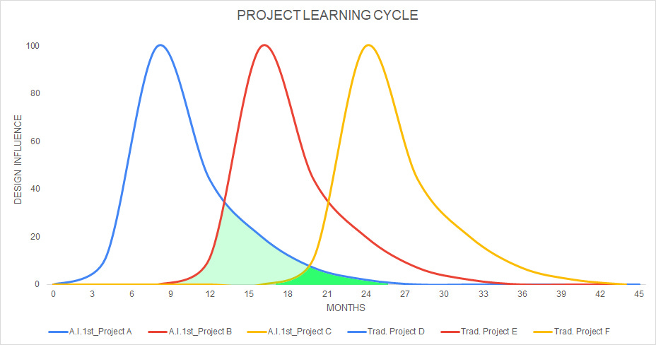 When we begin Project F, it is able to learn more complete lessons from Project D, because Project D is farther along in its life cycle (dark green).